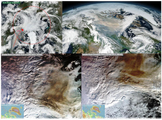 Smoke from the Canadian wildfires being transported towards the Arctic (a) VIIRS instrument on Suom-NPP on 16 August 2017, (b) VIIRS instrument on Suom-NPP on 15 August 2017, and (c,d) OLCI instrument on Sentinel 3 17–18 August 2017.