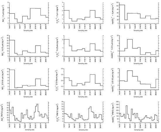 Focusing on the chemical composition, additional information appears. In this respect, Figure 4 reports the temporal behavior of three chemical species that can be used as markers of BB (nitrate and oxalate) and of transport from anthropic areas (non-sea salt sulphate, nssSO42–). They were analyzed both in bulk PM10 samples and size-segregated aerosols (<1, 10–2.5, and 2.5–1 µm; Section 2.2). Both nitrate and oxalate exhibit a peak in the 21–24 August period, in all the size fractions as well as in bulk PM10. This represents the second largest peak in August–September, with 6–9 September being characterized by the highest concentration of both markers in each class, except for the sub micrometric one, where the two peaks (20–24 August and 5–9 September) are comparable in intensity. Since the 21–24 August peak does not appear in the nssSO42– profile (while the 6–9 September increase is clearly visible), it is likely that the two concentration enhancements are related to two different transport events in terms of source region. Indeed, nssSO42- usually marks “haze” from lower latitude areas characterized by a higher anthropic impact while nitrates and oxalates are more closely linked to combustion processes and related chemical reactions during long-range transport [40,56,90].