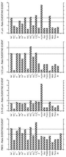 Ratios between average concentration of each determined chemical species and PM10 load in bulk and size-segregated aerosol during the event are presented in Figure 5 below.