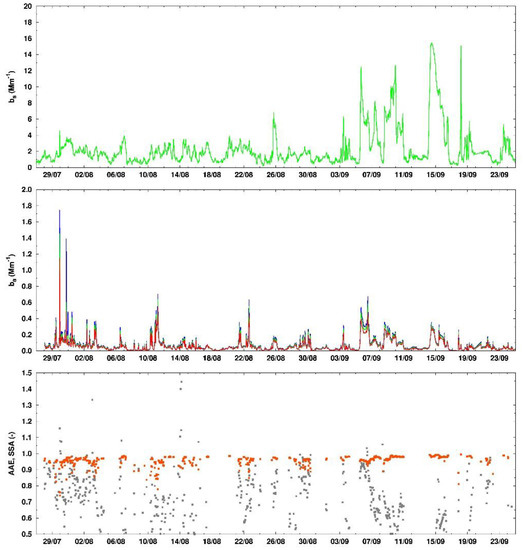 All of the aforementioned data highlighted the impact of BB at ground level. Simultaneously, aerosol optical properties (i.e., scattering and absorption coefficients) were measured at ground in the same site. Their temporal behavior for the entire for the period between 27 July and 24 September 2017 is reported in Figure 6. It is particularly evident that the scattering and absorption coefficients were quite stable till the beginning of September (around 2 ± 1 Mm–1 for bs and lower than 0.05 Mm–1 for ba). Only narrow peaks of ba were detected during August, with the exception of the 10–12 August period, when it reached values above 0.4 Mm–1 for a relatively long period (almost one day). This corresponds well with the mid-August period when over 1000 separate fires had been recorded in Canada and the burned area grew to almost 9000 km2 (Section 3.1). Moreover, a second significant absorption peak (again up to 0.6 Mm−1) was recorded in the period between 21 and 23 August, which is in agreement with the Canadian fire development when a large number of independent fires merged into a single larger wildfire covering an area of 4674 km2 in size (Section 3.1). During neither of these episodes, the increasing of the aerosol absorption was concurrent with an increase in the scattering, indicating an increase of the fraction of radiation-absorbing particles, like BB ones. This is confirmed also by the SSA values, dropping down to values well below 0.9, from the average background value above 0.95. After the beginning of September, very high values of bs (up to 15 Mm–1 on 14–15 September) and ba (up to 0.4 Mm–1 for more than one day on the 5–6 September) were measured. Despite these high values, only the first one (5–6 September) should be partly associated with a BB event, showing a SSA value slightly below the usual one, while during the second period (14–15 September) SSA remained stable above 0.95. On the overall considered period, AAE didn’t give meaningful information on the relative contribution of different types carbonaceous particles, presenting very scattered values not correlated with the BB intrusions.