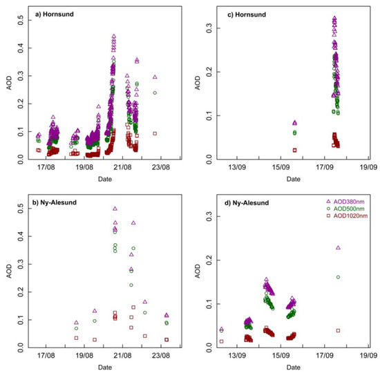 Focusing on Ny-Ålesund and Hornsund AOD values, during transport events, two outbreaks occurred in August over the low aerosol background typical of the Arctic area (<0.05 at 550 nm). The first pronounced peak occurred between 20 and 22 August. The AOD values (at 500 nm) recorded in Hornsund exhibit a sharp increase on 21 August (Figure 7a), reaching the maximum close to 0.4. Unfortunately, cloudy conditions occurred during the BB event in Ny-Ålesund and thus only few measurements were made at that period (Figure 7b). However, they reached values up to 0.5 suggesting that the BB plume affected the whole archipelago. Later, in the middle of September (between 14 and 17), there is an increase in AOD levels at both sites. In this case, data from Hornsund are cloud contaminated until 17 September (Figure 7c), when the AOD (at 500 nm) is beyond 0.2. In Ny-Ålesund (see Figure 7d), there is a value increase on 14 September but clouds also appeared again. These later September peaks relate to the last BB events in Canada.