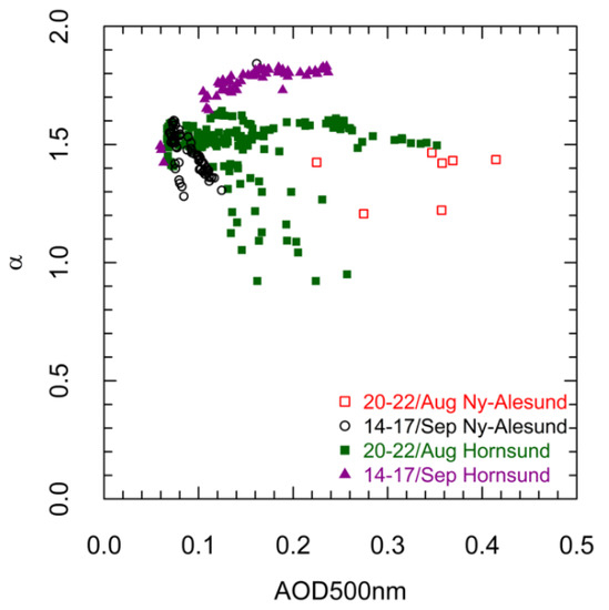 Ångström exponent (α) vs. aerosol optical depth at 500 nm (AOD 500 nm) retrievals form Hybrid Sky Scan inversions [94] at two AERONET sites in Spitsbergen.