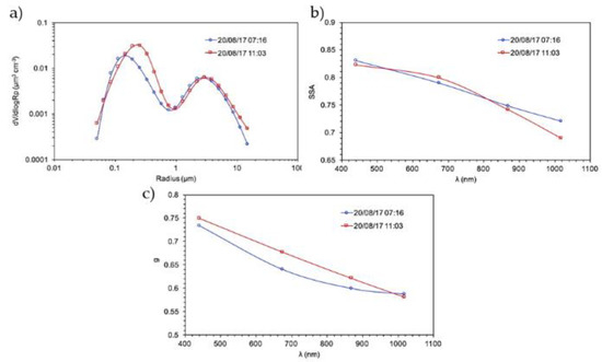 In addition, looking at the columnar size distribution of aerosol particles measured over Hornsund during the August event (Figure 9a), aerosol volume increased in the fine fraction along the day while the coarse mode was unaffected, which is in agreement with a BB signature, especially because the volume mode radius shifted from 0.15 to 0.26 µm along with aerosol size increasing due to both aging and condensation of organic material. Moreover, single scattering albedo (SSA; Figure 9b) decreased, especially in the infrared region (from 0.75 to 0.7) very sensible to an increase of the absorbing black carbon fraction generated by the event. The absolute values of SSA at different wavelengths were very low for the Arctic (below 0.85) stressing the absorbing nature of aerosols loaded along the atmospheric column and in agreement with ground-based observations reported in Figure 6. Finally, the asymmetry parameter (Figure 9c) increased along the day describing a situation in which the forward scattering was slightly enhanced by the volume mode radius increasing (Figure 9a).