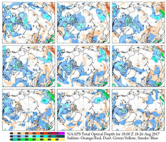 NAAPS Total Optical Depth, aerosol smoke over Spitsbergen in (a) 18:00 UTC 18 August, (b) 18:00 UTC 19 August, (c) 18:00 UTC 20 August, (d) 18:00 UTC 21 August, (e) 18:00 UTC 22 August, (f) 18:00 UTC 23 August, (g) 18:00 UTC 24 August, (h) 18:00 UTC 25 August, and (i) 18:00 UTC 26 August 2017.