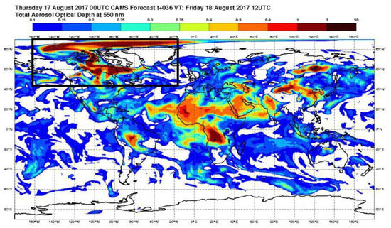 CAMS forecast of Total Aerosol Optical Depth at 550 nm for 18 August 2017.