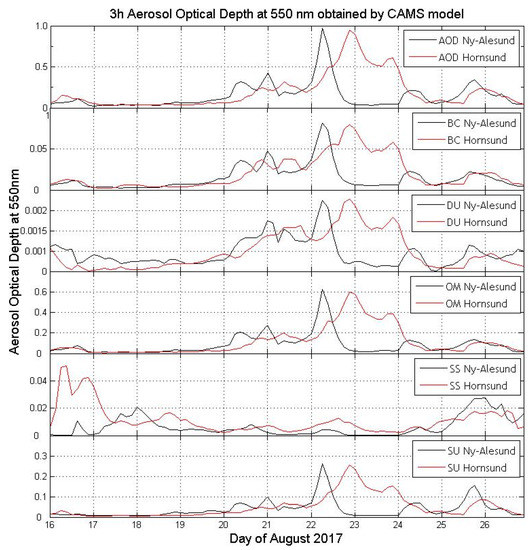 3 h Aerosol Optical Depth at 550 nm and 5 chemical components of Aerosol Optical Depth at 550 nm: black Carbon (BC), dust (DU), organic matter (OM), sea salt (SS), and sulphate (SU) in Hornsund (red lines) and Ny-Ålesund (black lines) between 16 and 27 August 2017.
