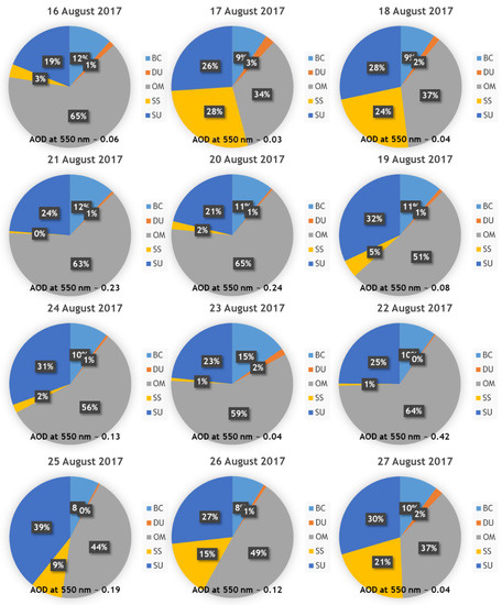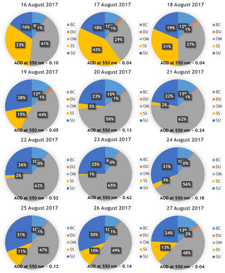 Values of aerosol optical depth presented in Figure 12 and calculated for Ny-Ålesund and Hornsund between 16 and 27 August 2017 (550 nm) show relatively low values between 17 and 19 August (below 0.1) at both locations and then a dramatic increase between 19/20 and 26 August 2017 (up to 1). There is a distinct shift in time, which is obvious due to the location of both stations, Ny-Ålesund is further north, thus an aerosol event started there earlier than in the southern station of Hornsund (Figure 12). The AOD values reached their peak at c. 0.9 (550 nm) on 22/23 August (Figure 12). Comparison with chemical components from the CAMS model shows that during events parameters connected to the BB episodes, especially BC and OM were showing increasingly higher values simultaneously with increasing AOD, while non-anthropogenic component—SS gets lower. The dust component associated with small particles confirms changes in chemistry of atmosphere during the BB event. Domination of OM component (up to 65%) is simultaneous with decreasing participation of SS between 22 and 27 August (1%–3%) at both locations (Figure 13 and Figure 14).