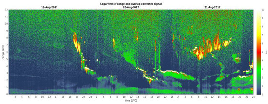 In order to highlight the impact of BB events in the Arctic, summer background aerosol conditions are recalled first as a base-line level for comparison. Svalbard summers are usually characterized by long periods of high cloudiness and fairly common precipitation episodes [93]. Usual summer values of AOD should not exceed 0.1 at 500 nm [47]. Such situation was observed at the beginning of summer and until early August 2017 in the investigated region. Particularly, average daily AOD values (500 nm) measured onboard r/v Oceania between June and early August 2017 varied from 0.032 to 0.067. Unfortunately, due to long cloudiness periods over the ocean, only very few data could be acquired from sun photometer measurements from board of r/v Oceania in the study period. Lidar based measurements, carried out using the AWI KARL lidar (Ny-Ålesund—June 2017) also showed a small presence of aerosol particles in the air above Svalbard (Figure S2) confirming the representativeness of the investigated Arctic summer prior to the BB events (details in Supplementary Material).