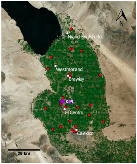 The Imperial Valley, which is an agriculturally dominated area located in Southeastern California adjacent to the US-Mexico border, has among the highest particulate matter (PM) air pollution concentrations in the United States. The area has historically been nonattainment with respect to both PM10 (PM mass concentration of particles less than 10 micrometers aerodynamic diameter) and PM2.5 (PM mass concentration of particles less than 2.5 micrometers aerodynamic diameter) ambient air standards [1,2]. Imperial County also has the highest rates of asthma emergency room visits and hospitalization among school-age children of all counties in California [3]. The PM2.5 fraction yields the strongest correlations with respiratory and cardiovascular health effects due to the ability of these fine particles to penetrate deep into the lungs [4]. Larger PM10 particles deposit in the nose and upper airways and are associated with increased inflammation, asthma, and respiratory effects [5,6]. Windblown dust, which is a particularly important component of coarse PM10, has been associated with a variety of adverse health effects, including cardiovascular mortality [7], heart attacks [8], and Coccidioidomycosis, commonly known as Valley Fever, an infection caused by inhalation of a soil-dwelling fungus. Valley Fever has increased in incidence by 800% from 1998 to 2011 across the United States, with much of this increase in the southwestern U.S., where windblown dust is common [9,10].