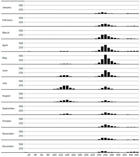 The common occurrence of strong WSW winds in the valley is shown in Figure 2, which presents histograms of the hours of high wind speed (greater than 10 mph) at KIPL organized by wind direction and month. Strong winds from the west-southwesterly sector (230° to 300°) occur over all months but are most common during the spring. The other main period of high wind speed is in the summer from the southeasterly sector (100° to 150°), associated with the summer monsoonal flow from the Gulf of California.