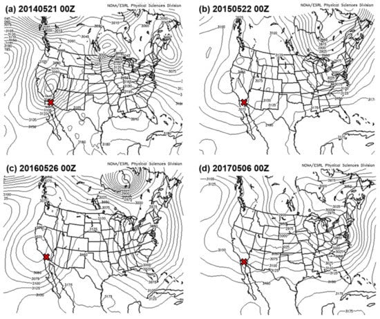 The 700 mb geopotential height fields (meters) from the North American Regional Reanalysis [28] for four west-southwesterly (WSW) high wind events affecting the Imperial Valley. The red X on each panel is the approximate location of valley. Plots were created from the NARR plotting website operated by NOAA/OAR/ESRL PSD, Boulder, Colorado, USA (https://www.esrl.noaa.gov/psd/data/gridded/data.narr.html).