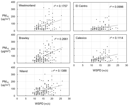 Daily averaged beta-attenuation monitors (BAMS) PM10 concentrations versus daily-averaged wind speed at KIPL for the selected springtime WSW wind events in the Imperial Valley. The coefficient of determination (r2) of the plotted best-fit regression line is indicated on each panel. Data comprise 165 days between 2013 and 2019 for Brawley and Niland, and 104 days between 2016 and 2019 for Calexico, El Centro, and Westmorland. Criteria of event selection is given in Section 2.3.