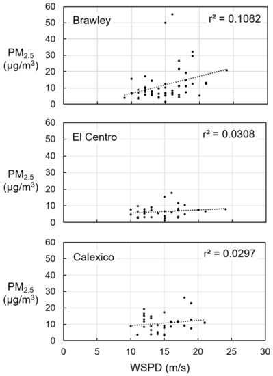 Daily averaged gravimetric PM2.5 concentrations versus daily-averaged wind speed at KIPL for selected springtime WSW wind events in the Imperial Valley. The coefficient of determination (r2) of the plotted best-fit regression line is indicated on each panel. Data comprise 57 daily events between 2013 and 2019 at Brawley, and 55 daily events between 2013 and 2019 for Calexico and El Centro. Criteria of event selection is given in Section 2.3.