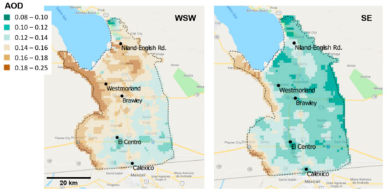 The average MAIAC AOD fields of the WSW and SE sets are shown in Figure 6. The AOD across the valley is higher in the WSW set, consistent with its higher PM associated with windblown dust (Table 2). The most distinguishing spatial feature is the swath of relatively high AOD (≈0.15 and higher) spanning the northwestern valley across the Brawley/Westmorland to Niland area, with lower AOD across the southern and southeastern valley through El Centro and Calexico. This is consistent with the higher PM10 and PM2.5 concentrations at the northern valley routine sites (Section 3.1) but presents a clearer indication of the underlying spatial patterns. Excluding the band of high AOD along the western rim of the valley, there are two broad regions of AOD maxima, one around the Brawley/Westmorland area and another around and just south of Niland. Since the Brawley/Westmorland maximum does not appear in the SE control field, this appears to be a hotspot associated with windblown dust. The Niland area maximum, however, is more uncertain since relatively high AOD in this area is also seen in the SE control field, although with a lower value. Several other patchy, localized areas of relatively high AOD common to both the WSW and SE sets can also be seen, for example, along a north-south strip running between Brawley to El Centro, the band of high AOD along the western rim of the valley, and patches of relatively high AOD around and just north of Calexico.