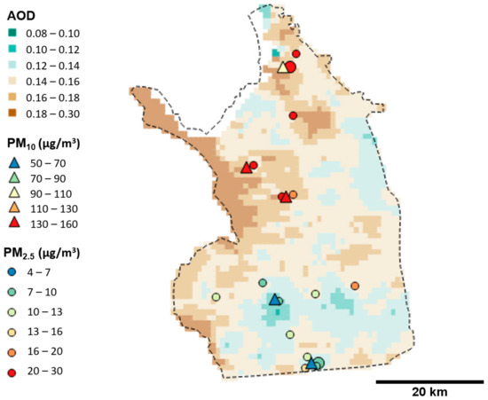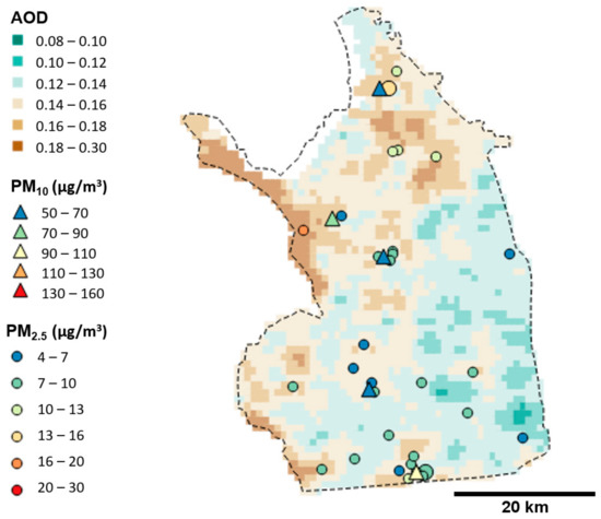 Average MAIAC AOD fields for the WSW set during 2016 (n = 11, see Table 2) overlaid with ground PM concentrations from routine PM10 sites (large triangles), routine PM2.5 sites (large circles), and IVAN PM2.5 sites (small circles). Plotted PM10 and PM2.5 concentrations are averages of available measurements over the period at hour encompassing Aqua satellite overpass time.
