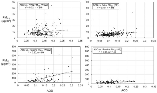 Scatterplots and regression statistics of paired MAIAC AOD and measured PM concentrations at overpass hour; (top left) AOD versus IVAN PM2.5 for the WSW set, (top right) AOD versus IVAN PM2.5 for the SE set, (bottom left) AOD versus routine PM10 for the WSW set, and (bottom right) AOD versus routine PM10 for the SE set.