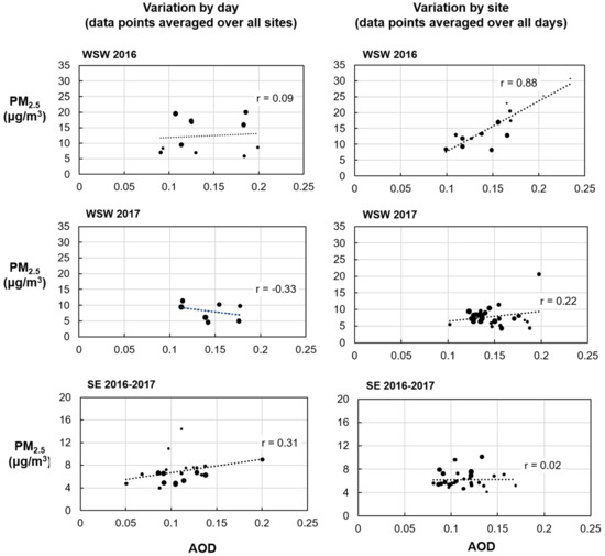 Scatterplots of paired AOD vs. IVAN PM2.5 site and day averaged. Left panels are site averaged to highlight temporal variability across the days comprising sets. Right panels are day averaged to highlight spatial variability across sites comprising sets; (top) 2016 WSW, (middle) 2017 WSW, and (bottom) SE 2016 to 2017. Symbols sized according to the number of paired AOD-PM samples per data point: 7 to 11 sites and 1 to 11 days (WSW 2016); 16 to 26 sites and 2 to 7 days (WSW 2017); 5 to 26 sites and 1 to 22 days (SE 2016 to 2017).