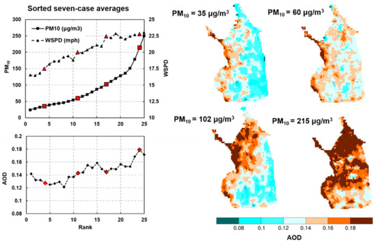 The main points of the detailed analysis are summarized in Figure 12, which shows the transition of the WSW data with successively higher PM10 levels across the events organized as running seven-case averages sorted lowest to highest according to the Brawley-Niland average PM10 concentration of each seven-case average. Seven cases were chosen for the running averages to be a reasonably high number, and consistent with the number of cases comprising the 2017 WSW set. Generally, increasing wind speed and AOD with increasing PM10 across the sorted set is seen (left panel). Viewing AOD patterns across the valley of four selected seven-case averages of successively higher PM10 (right panel), the corroborated area of high AOD spanning the northwest valley first becomes visually clear at PM10 ≈ 100 μg/m3, and increasingly so, covering the entire northern valley, as PM10 increases to 200 μg/m3. Below 100 μg/m3, this feature is not clearly evident, and instead images appear more similar to 2017 (Figure 9) when localized relatively high AOD areas not strongly corroborated by ground PM are predominant. MAIAC, therefore, appears to be able to distinguish surface PM spatial features of windblown dust in the analyzed data during relatively strong WSW events, with PM10 ≈ 100 μg/m3 appearing to be a rough cutoff when features corroborated by ground monitors become distinguishable. Again, the main feature identified is the broad area of high AOD/PM across the northwestern valley extending from Brawley-Westmorland towards the southern shore of the Salton Sea and eastward to Niland.