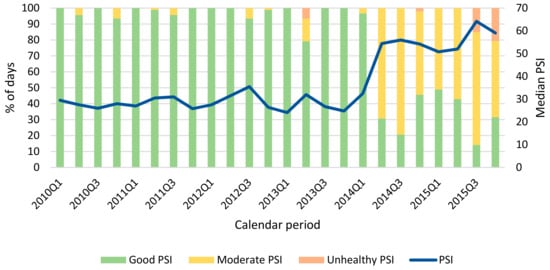 A total of 105,504 deaths was observed during the study period. Over the study period, 16,437 deaths were reported in 2010, 16,850 deaths in 2011, 17,231 deaths in 2012, 17,783 deaths in 2013, 18,243 deaths in 2014 and 18,960 deaths in 2015. Figure 1 shows the time trend of PSI over the years [41,42,43]. The median daily average PSI in each quarter of each year of the study period, as well as the proportions of days with daily average PSI in the good/moderate/unhealthy range, are shown in Figure 1. The PSI level was higher in 2014 and 2015 than earlier years.