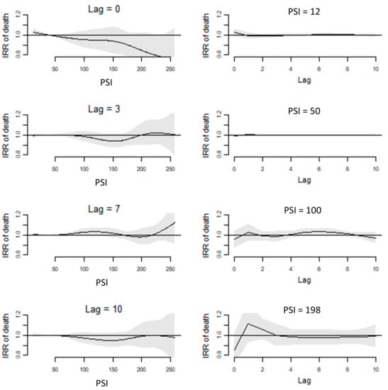 Figure 2 shows the IRR of mortality by PSI at specific lag 0, 3, 7 and 10 and by lag at specific PSI corresponding to approximately (rounded up to the nearest integer) the 5th (PSI = 12) and 95th (PSI = 198) percentile of the PSI distribution, cut-off between the good and moderate PSI ranges (PSI = 50), and cut-off between the moderate and unhealthy PSI ranges (PSI = 100). The plots of IRR by PSI at specific lag indicated that at lag 7, the IRR of mortality spiked in the very unhealthy range compared to good, moderate, and unhealthy ranges; the association was, however, not significant.