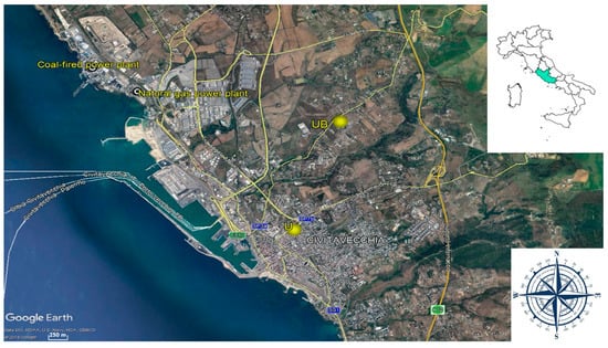 Map of the harbor-industrial area in Civitavecchia—the coal-fired power plant, the natural gas power plant and the two sampling sites, that is, U located in downtown Civitavecchia and Urban Background (UB) located outside the urban area, are identified.