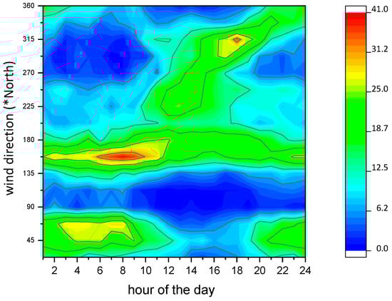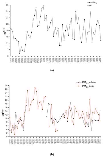 In the urban area, due to maintenance works, data of PM2.5 are missing between December and January, (in Figure 4b there is a “hole” in that period). The concentrations are similar on both sites—at the suburban site, an average value of 12.6 µg m−3 is recorded whereas at urban site a mean value of 9.7 µg m−3. This is most likely due to the missing measurement period (December–January) at this location—in fact, wintertime shows unfavorable meteorological conditions for the pollution dispersion [42,43], allowing high levels of pollutants. PM10 measurements at the suburban site show a mean value of 19 µg m−3 for the entire period—the measurements confirm the high pollution level recorded during January and December period as provided by the Figure 4a.