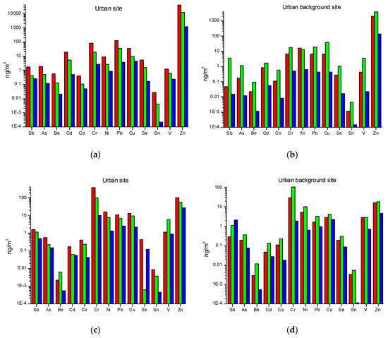 Metals and metalloids in PM10 and PM2.5 in the (a,c) Urban Site and (b,d) Urban Background, respectively—both the PM fractions highlight the presence of many anthropogenic elements; it is also worth noting the predominance of Crtot, in the PM2.5 fraction in both sampling sites, which can be associated to coal combustion (red: sector #1; green: sector #2; blue: sector #3).