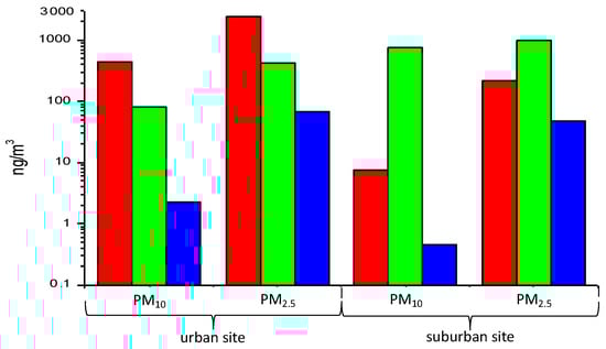The results of chemical analysis performed on PM2.5 and PM10 are represented in Table 2 and Table 3 for the mean levels of inorganic (i.e., metals) and organic (PCDD/Fs, PAHs and PCB and DL-PCB) substances in cartridges sampled for each sector. Data in Table 2 and Table 3 concern the whole period mean concentration of each pollutants both in urban and suburban site. In Tables S1–S8 of the Supplementary Material report all the analytical determinations performed sector-by-sector during the whole sampling periods in both locations are reported.