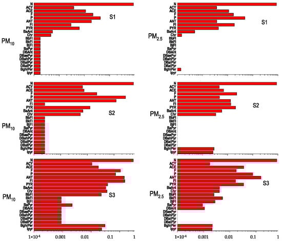 In general the urban location measures higher PAH concentrations than the suburban one, even though the concentrations always remain below values compatible with the monitored urban territorial context, and, the benzo (a)pyrene (B (a)P) concentrations, that is, the only PAH regulated by Legislative Decree 155/2010 [1], in PM10 are always lower than 1.0 ng m−3 which is the limit for the annual average. Just one measure (Tables S3 and S4 of the Supplementary Material), performed in U site records a concentration of B(a)P greater than 1.0 ng m−3.