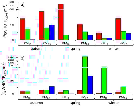 Polychlorinated dibenzodioxin and Polychlorinated dibenzofuran (PCDD/F) and Polychlorinated biphenyl (PCB) concentrations in (a) urban site and (b) suburban site—sector #3 shows during same monitoring period values greater or comparable with the other sectors suggesting a widespread contamination likely due to the presence of multiple emissive sources near the sampling site (red: sector #1; green: sector #2; blue: sector #3).
