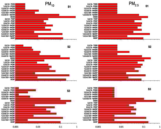 From the scientific literature [68,69,70,71,72] a similar profile is highlighted for PCDD/F emitted by large coal combustion plants. The PM10 and PM2.5 profiles at U sector #1 are similar.5 only in the autumn period, whereas they are different in the other two periods. The profiles of sector #2 of PM2.5 show greater variability, between periods and between congeners contributions. The PM10 profiles at sector #2 differ from those of PM2.5 and show differences among periods in terms of detected congeners and their relative contribution. The PCDD/Fs profile sampled at sector #3 in PM2.5 shows a wide variability of detected congeners in the different samples, according to the large sampling sector that cannot be associated with any specific source.
