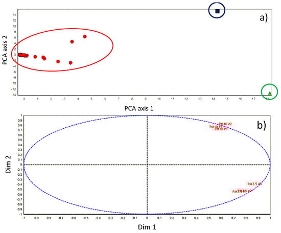 The HAC shows the presence of three clusters in both sites but the components in the clusters are differently distributed—in particular, in U site cluster #1 is formed by 198 compounds whereas clusters #2 and #3 by 1 (Se and Fluorene, respectively, in PM2.5, sector #2, both in fall period); at UB site cluster #1 is formed by three compounds (Naphthalene in PM2.5, sectors #1 and #2, in winter period; Cu in PM2.5, sector #1, in fall period) and cluster #3 by 2 (Naphthalene in PM10, sector #2, in winter; Naphthalene in PM10, sector #2, in fall) whereas cluster #2 by 195 components. Because the dendrograms are not so explicative, the authors would like to show the PCA representations and the correlation scatterplots—two variables are able to explain almost 85% of the entire dataset. This occurrence is a confirmation about the high correlation in the data and the effectiveness of the samplings performed. Figure 10 shows the PCA (a) and the correlation scatterplot (b) obtained analyzing the data collected at urban site and the PCA (c) and the correlation scatterplot (d) obtained analyzing the data collected at suburban site.