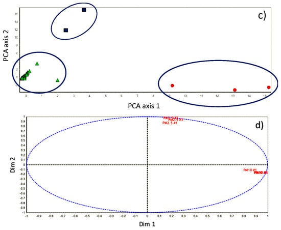 The PCA plots (Figure 10a,c) evidence how the clusters are formed. They appear different according to the locations. The information about Fluorene and Naphthalene is quite important—it confirms the source apportionment to their levels due to the presence of the large port in the investigated area. Likewise, Figure 10b,d is also explicative—the PM10 and PM2.5 samples groups in similar ways in both cases but preferring opposite axes.