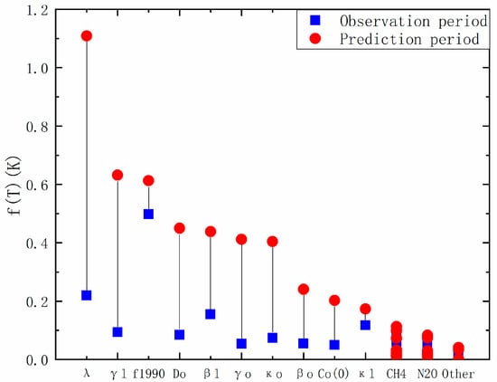 As noted above, the objective function f(T) approximately depicts the temperature change caused by the change of a parameter. To compare the sensitivity of different parameters, Figure 2 shows the maximum objective function value of each parameter. Since future climate change is concerned matter, the f(T) in the prediction period (the red point in Figure 2) is used to clarify the parameters. We define the ones with f(T) larger than 0.4 K as sensitive parameters, which is about 10% of temperature change from pre-industry to the 21st century. Under this standard the climate sensitivity parameter λ, land and ocean temperature-driven carbon feedbacks and , the carbon diffusion coefficient , ocean heat capacity , heat diffusion Do and aerosol radiative forcing f1990 as sensitive parameters. We can see those insensitive parameters are preindustrial CO2 concentration, deep–shallow ocean carbon diffusion coefficient, deep ocean initial carbon stock, and all parameters related to CH4 and N2O. It suggests the separation of shallow and deep ocean components in this model is not particularly useful compared to other more simplified 1-layer energy balance models (such as in []).