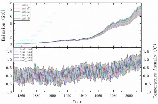 Since the sensitive parameters can affect the output of the model (the most sensitive one can make a temperature difference more than 0.4 °C or more than 10%), a stricter parameters’ range is needed. To that end, we consider the inputs of the MiCES model as random variables and analyzed the ensembles of simulations with distributions of emission and temperature. According to Gütschow et al. [], we consider the uncertainty range of emissions as 14%, and the uncertainty range of temperature comes from Frank [] as ±0.46 °C. Then we run the model multiple times with randomly picked N emissions and N temperatures in their uncertainty range to obtain the parameter uncertainty. As shown in Figure 3, temperature samples produced by getting each time point as a random temperature, while the emission samples are produced by changing the whole series to a random rate. Since only the uncertainty of CO2 emissions is considered, only the parameters directly connected with CO2 are calculated.