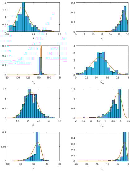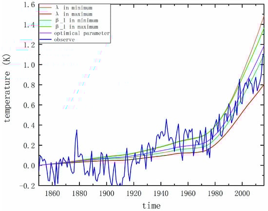 As shown in Figure 4, the distributions of key parameters are fitted by several kinds of distributions, to make the residuals smallest: and are fitted by normal distribution; , , and are fitted by extreme value distribution; λ is fitted by burr distribution and is fitted by stable distribution. We define 95% confidence interval as the reference range of each parameter, as shown in Table 3 with Sanderson’s [] range for comparison. The climate sensitivity parameter’s range is 2.15–5.79 K(Wm−2)−1 at a 95% confidence level, and the expected value is 3.27 K(Wm−2)−1. As shown in Table 3, the expected values of the parameters are significantly different from those suggested by Sanderson’s []. Specifically, the range of land and ocean temperature-driven carbon feedbacks and is [−0.5, 0.5] and [0, 0.5] by Sanderson et al. []. Due to the reason that more carbon will be released to atmosphere with temperature rise, the parameters are set to be negative as [−200, 0] and are obtained the probability distribution between [−74.0, −45.5] and [−5.92, −0.26] as shown in Figure 4, which are more close to that of Arora [].
