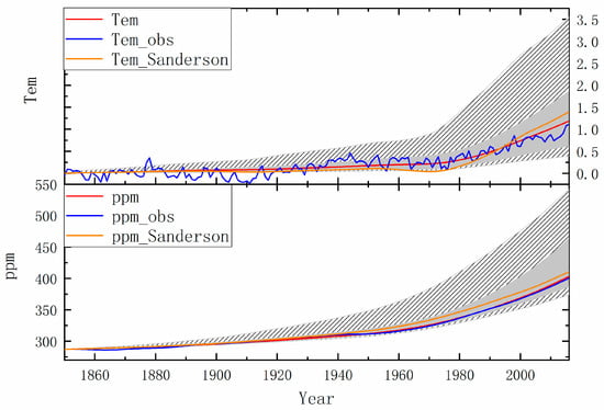 Figure 5 shows the goodness of fitting the observed temperature and emission and the uncertainty range using parameters suggested in Table 3. The uncertainty ranges of estimated temperature and CO2 concentrations are also plotted in the figure with comparison to those of Sanderson’s. The Sanderson’s range of temperature in 2016 is 0.4–3.5 °C, while our calculated temperature is narrowed to 0.6–1.9 °C. For the concentration of CO2 in the atmosphere, our result is 380–470 ppm other than Sanderson’s 375–540 ppm. It can be seen that the observed temperature basically falls within the uncertainty range calculated by our result, and so does the CO2 concentration. The covariance between output temperature and the observed temperature is R2 = 0.903, which implies the high reliability of the expected value of parameters.