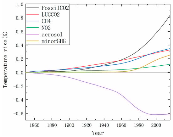 Furthermore, the MiCES model is run to calculate the contribution of each greenhouse gas to temperature increase by running each greenhouse gas only at one time with our optimal parameter set. As shown in Figure 7, fossil fuel’s emission of CO2 is the most critical contributor in GHGs, which caused about 0.84 °C temperature rise from 1850 to 2016. Emissions of CO2 emitted by land-use change, methane, N2O, and other minor GHGs lead to a temperature rise of 0.33 °C, 0.35 °C, 0.12 °C, and 0.25 °C, respectively. Unlike above greenhouse gases, the aerosol has a negative effect on temperature rise, which contributed −0.61 °C in total. As shown in Figure 6, the effect of aerosol, the slope of the curve, is smaller since the 1990s. That is a result of decreasing the emission of sulfate, while on the other hand, the decreasing sensitivity of f1990 (aerosol radiative forcing in 1990) also leads to a less critical aerosol process in the future.