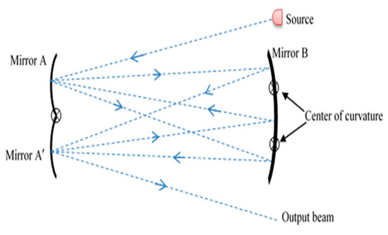 The centers of mirrors A and A’ are on the front surface of mirror B. The center of mirror B is at the halfway point between other two mirrors. The pathlength depends on the radius of curvature and the position of the centers of A and A’ [38].