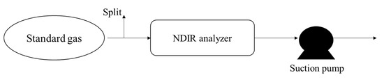 First, N2 (99.999%, DongA Ltd. Co., Gwangju, Republic of Korea) was used to calibrate the zero point. Then, CO2 was used to calibrate the span points of the analyzer. The CO2 concentration is shown in Table 1. After calibration, N2 was introduced into the analyzer to determine the lower detection limit. The interval time for the recording was three minutes, and it was repeated 20 times [39]. The lower detection limit (DL) was calculated using the following Equation (1):