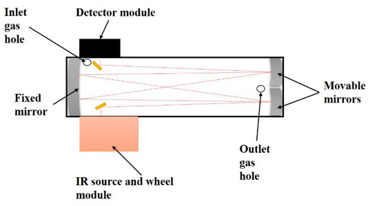 Until recently, CO2 has been continuously measured by Fourier-transform infrared (FTIR) spectroscopy, cavity ring-down spectroscopy (CRDS), off-axis integrated cavity output spectroscopy (OA-ICOS) and nondispersive infrared (NDIR) spectroscopy [20]. A FTIR analyzer consists generally of a glow bar infrared (IR) source, a detector and an interferometer. The FTIR analyzer determines the infrared spectral information simultaneously, as opposed to a few frequencies at a time. Instead of selecting a specific wavelength or region within the entire infrared region concerned, the FTIR light source uses all the frequencies in the IR region of concern [21]. A CRDS analyzer includes a laser source, highly reflective mirrors and a detector. It measures the changes in the decay rate of light. The time of light decay provides an exact, noninvasive and rapid means of detecting contaminants in gases [21,22]. An OA-ICOS analyzer also comprises high-reflectivity mirrors, as in the CRDS method. Unlike CRDS, OA-ICOS does not require sophisticated optical and electronic components for the optical mode matching and coupling of the single-frequency laser to the optical cavity modes [23]. Among these techniques, NDIR technology has been widely used to determine CO2 concentrations [24,25,26,27,28,29,30]. As an application of infrared spectroscopy, NDIR technology has been used to detect air pollutants that can absorb the infrared spectrum [31]. A typical NDIR analyzer consists of a light source, a light chopper, a gas chamber and a detector, coupled with a band-pass filter [32]. Various infrared (IR) light sources with different materials, such as a laser, Globar, Nernst glower and nichrome wire, can be used [31]. The light chopper is a rotating solid disk with several apertures that periodically interrupts the light beam [32,33]. The gas chamber is an empty box where sample gases contact with an IR beam. An IR detector is a device converting the temperature into an electrical signal. Thermal and quantum types are the two main ones of IR detectors [34]. Each target gas absorbs IR light at a specific wavelength (e.g., CO2 at 4.26 μm, CO at 4.6 μm, NO at 5.3 μm, NO2 at 6.23 μm, etc.). By using different IR band-pass filters (BPF), many gases can be analyzed at the same time with one IR source and detector [32]. A BPF is a nondispersive element that allows IR radiation at a specific wavelength [31]. The BPF comprises multilayered thin films that are attached on a subtract such as glass [32]. In a comparison with other spectroscopic techniques, NDIR has low energy consumption, because IR sources with wavelengths in the range of 1–15 µm can operate at a lower temperature than other sources [35].