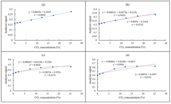 The relationships between the optical pathlength and the analyzer signals are depicted in Figure 5. Low values of standard deviation (SD) denoted good reproducibility of the experimental results. The sensitivity of the analyzer increased with the increase with the optical pathlengths. On the basis of the Beer–Lambert law, the increase of the pathlength resulted in an increase of the absorbance. Thus, this led to an improvement of the analyzer’s sensitivity. However, since the IR absorbance of CO2 was very strong, and its concentration was very high percentwise, most of its IR energy was absorbed. Therefore, the relationship between the analyzer signals and the CO2 concentrations were nonlinear at long pathlengths (Figure 5b–d). In contrast, it was linear at the 4.8-m of pathlength (Figure 5a). As for CO2 concentrations from 17% to 25%, sensitivities with respect to 4.8-, 8.0-, 10.4- and 16.0-m pathlengths were 0.045, 0.023, 0.006 and 0.002, respectively. Particularly, at 16.0 m of pathlength, the analyzer signals at 17% and 25% of CO2 were 0.6282 and 0.6294, respectively. These analyzer signals reflected the IR absorption rate of CO2, and they were almost similar. It suggests that the sensitivity at a high concentration of CO2 should decrease with the increase in optical pathlength. Thus, longer pathlengths may not always translate into better results, in the case of high-IR absorption gases at high concentrations.