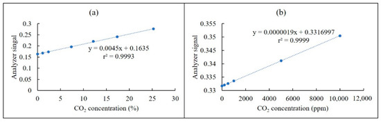 From the above experimental results, we determined that the practical pathlengths for the CO2 NDIR analyzer were 4.8 and 10.4 m. The optical pathlength of the percentage channel was 4.8 and that of the ppmv channel was 10.4 m. The calibration curves of CO2 for the two channels are presented in Figure 6. Low values of standard deviation (SD) indicated that the analyzer had good reproducibility.