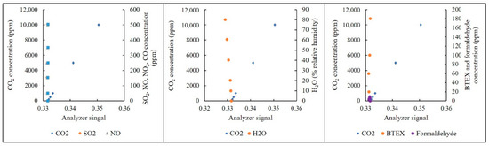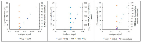 The effects of CO, NO2, SO2, H2O (vapor), BTEX and formaldehyde interference on the NDIR analyzer with respect to the percentage channel are depicted in Figure 7. Those with respect to the ppmv channel are presented in Figure 8. Linear regression curves and selectivity coefficients of those interference gases are shown in Table 3.
