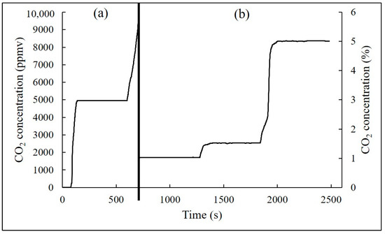 H2O (vapor) was generated using the bubble method at 25 °C. On the basis of relative humidity, the humidity varied at 0%, 5%, 10%, 20%, 50% and 80%. Each concentration of each gas was introduced into the analyzer for 5 min. The experiment was repeated three times. The measurement error of the analyzer was tested using the Korean national standard method [39]. First, N2 and CO2 (20%) for the percentage channel and CO2 (8000 ppmv) for the ppmv channel were used to calibrate the analyzer. Then, N2 and CO2 (10%) for the percentage channel and CO2 (500 ppmv) for the ppmv channel were introduced into the analyzer to evaluate the accuracy. The experiment was repeated 5 times. To evaluate the continuous response of the analyzer, various concentrations of CO2 were continuously introduced into the analyzer. A dilutor (Sonimix 2106-10, LNI Swissgas S.A., Versoix, Switzerland) was used to dilute 5.01% of CO2 standard gas with N2 to produce 4950 ppm and 1.02%, 1.51% and 5.01% of CO2. Each level was introduced into the analyzer for 10 min.