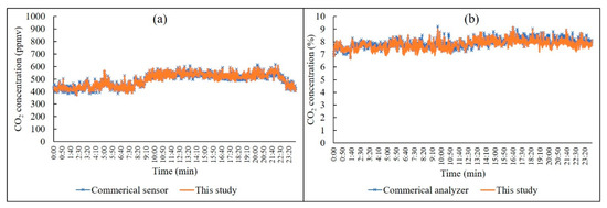 In terms of the measurement error, it was found that the measurement error of the CO2 analyzer in this study was ±0.4% at the ppmv channel and ±0.9% at the percentage channel. The continuous response of the analyzer with regards to different levels of CO2 is depicted in Figure 9. It was found that the measurement errors for continuous monitoring were also less than 0.4% and 0.9%, respectively, for the ppmv and percentage levels. Sun et al. (2013) reported that the measurement error of their prototype NDIR analyzer was ±1~1.5%, and its detection limit of CO2 (in the detection range of 0~17%) was < 0.3% [28]. Results of the comparison between the analyzer in this study and commercial products are presented in Figure 10. It was found that the relative percentage differences of the measurement data for 24 h between the analyzer used in this study and the commercial sensor/analyzer were 2.16% and 3.34%, respectively. Therefore, the CO2 NDIR analyzer in this study was capable of the detection of CO2 in indoor air at the ppmv, as well as the percentage, levels. At the ppmv level, the measurement results could be meaningfully applied for an indoor air quality assessment. At the percentage level, CO2 might be used as an indicator for a fire alarm.
