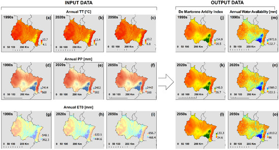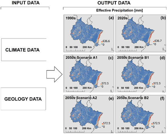 Thus, the environmental planning for the near future and mid-century time period could consider the original maps that we have developed in this work. Moreover, the comprehensive gridded dataset contributes to environmental risk evaluation and to the calibration of various models (e.g., groundwater flow models, slope stability analyses). The technical validation of the presented data and methodology is supported by the previous publications [42,43], while future work may develop a more extensive dataset including hydrological models based on runoff and groundwater flow, spring discharge monitoring, and field research data including soil sampling and geotechnical investigations.