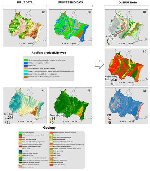 The DEM layer is important in water resources and environmental risks studies, not only because of the influence of variations of relief topography and slopes’ angle gradient on the water flow direction and infiltration control, but also because of their role in flooding, flow accumulation, and slope stability. With that in mind, using the slope angle layer (Figure 2f) together with the PIC layer, which reflects the lithology permeability, a potential infiltration map (PIM) was drawn (Figure 2g). The calculation is based on the reasoning that where the PIC is higher and the slope angle is lower, the infiltration values will be higher. This approach was developed using the ratio between PIC and slope angle (normalized values). The procedure was also applied before in studies of groundwater [9,50]. ArcGIS environment served as the software to analyze and manage the data assignation of aquifers’ features in the attribute table.