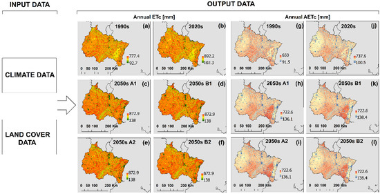 Spatial distribution of annual crop evapotranspiration (ETc) and annual actual crop evapotranspiration (AETc) in the Grand Est region. (a) ETc in 1990s. (b) ETc in 2050s, Scenario A1. (c) ETc in 2050s, Scenario A2. (d) ETc in 2020s. (e) ETc in 2050s, Scenario B1. (f) ETc in 2050s, Scenario B2. (g) AETc in 1990s. (h) AETc in 2050s, Scenario A1. (i) AETc in 2050s, Scenario A2. (j) AETc in 2020s. (k) AETc in 2050s, Scenario B1. (l) AETc in 2050s, Scenario B2.