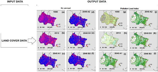 Spatial distribution of crop coefficient (Kc) and pollution load index (PLI) in the Grand Est region. (a) Kc in 1990s. (b) Kc in 2012. (c) Kc in 2040, Scenario A1. (d) Kc in 2040, Scenario A2. (e) Kc in 2040, Scenario B1. (f) Kc in 2040, Scenario B2. (g) PLI in 1990s. (h) PLI in 2012. (i) PLI in 2040, Scenario A1. (j) PLI in 2040, Scenario A2. (k) PLI in 2040, Scenario B1. (l) PLI in 2040, Scenario B2.